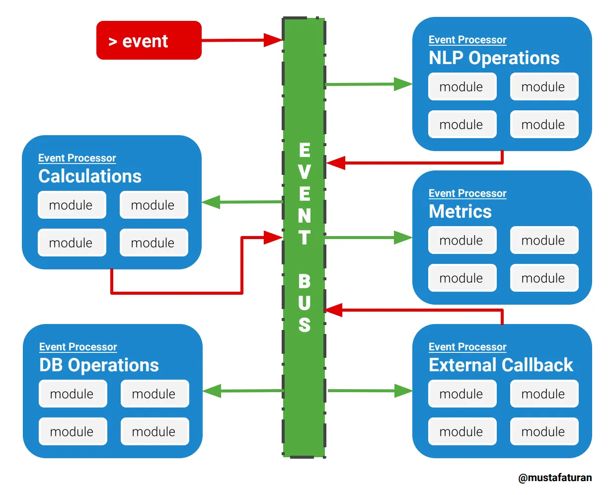 이벤트-버스 패턴은 확장이 용이한 반응형 애플리케이션을 만들기 위한 분산 비동기 아키텍처 패턴입니다. 소스가 특정 채널에 이벤트 메시지를 발행하면, 해당 채널을 구독하는 리스너들이 메세지를 받아 이벤트를 처리하는 방식입니다. 이를 구성하는 주요 4가지 컴포넌트로 소스, 리스너, 채널, 버스가 있습니다.